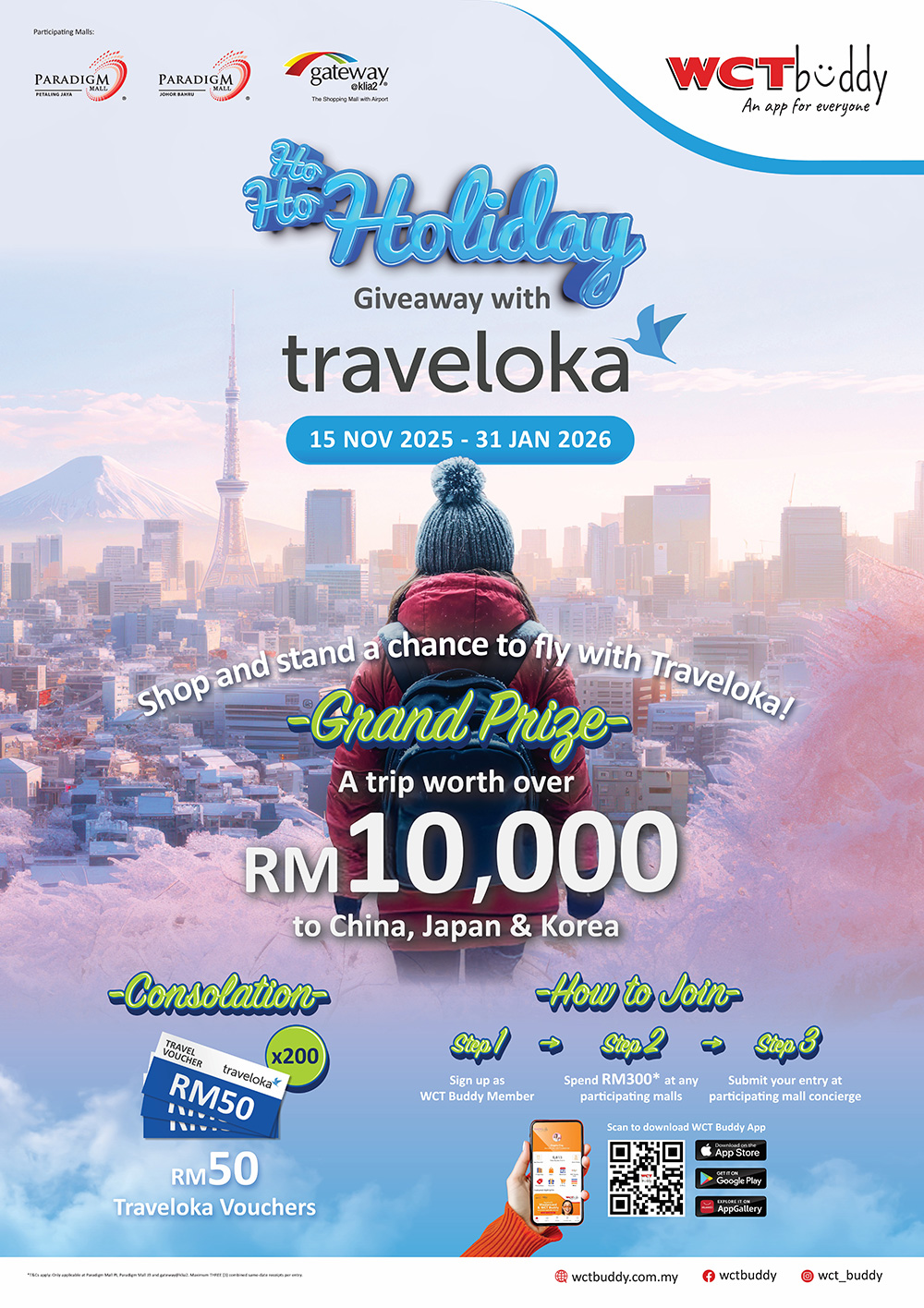 • To participate, each eligible member must spend a minimum of RM300 in a maximum of three (3) same-day receipts at any participating malls including Paradigm Mall Petaling Jaya, Paradigm Mall Johor Bahru, or gateway@klia2 to receive one (1) entry for the Hohoholiday Giveaway with Traveloka Campaign during the Campaign Period. Traveloka members are required to present their member profile page via Traveloka app to entitle double entries (2x) per qualifying spend. The more entries a member submits, the higher their chances of winning.
