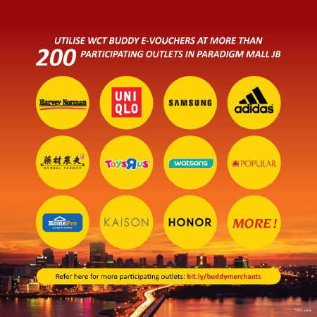 Paradigm Mall Johor Bahru E-Vouchers will be credited into the members’ WCT Buddy App accounts within three (3) working days after the purchase is made. These E-Vouchers can only be used at WCT Buddy participating merchants in Paradigm Mall Johor Bahru.